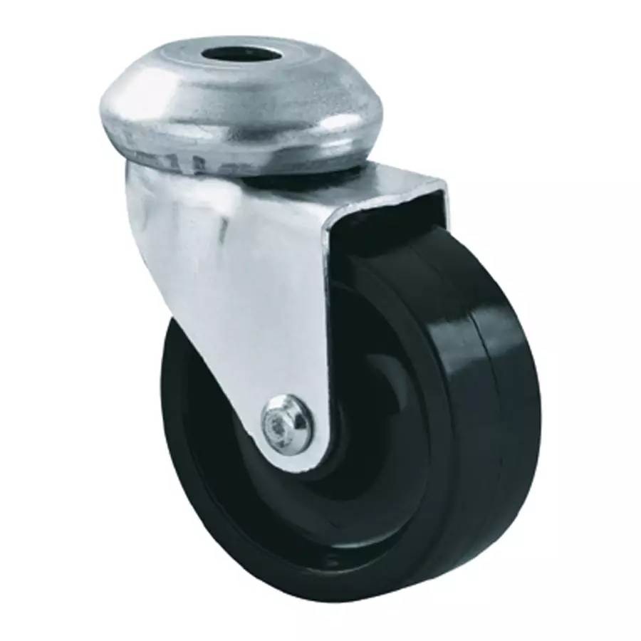 Sinkitystä teräslevystä valmistettu haarukka on varustettu yksirivisellä kuulalaakeroinnilla, joka takaa sujuvan ja kevyen 360° kääntyvyyden 15 kg kuormalla. Itse pyörä on varmatoimisella ja huoltovapaalla liukulaakeroinnilla.